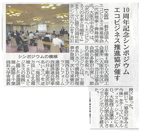 1995年に設立された協会は今期で10周年を迎えた「次の10年へ~エコビジネスの未来と可能性」をテーマに記念講演、パネルデスカッションを行った。シンポジウムの基調講演には千葉商科大学客員教授の笹谷秀夫氏の「発信型三方良しによる環境・SDGsビジネスの実践」があった